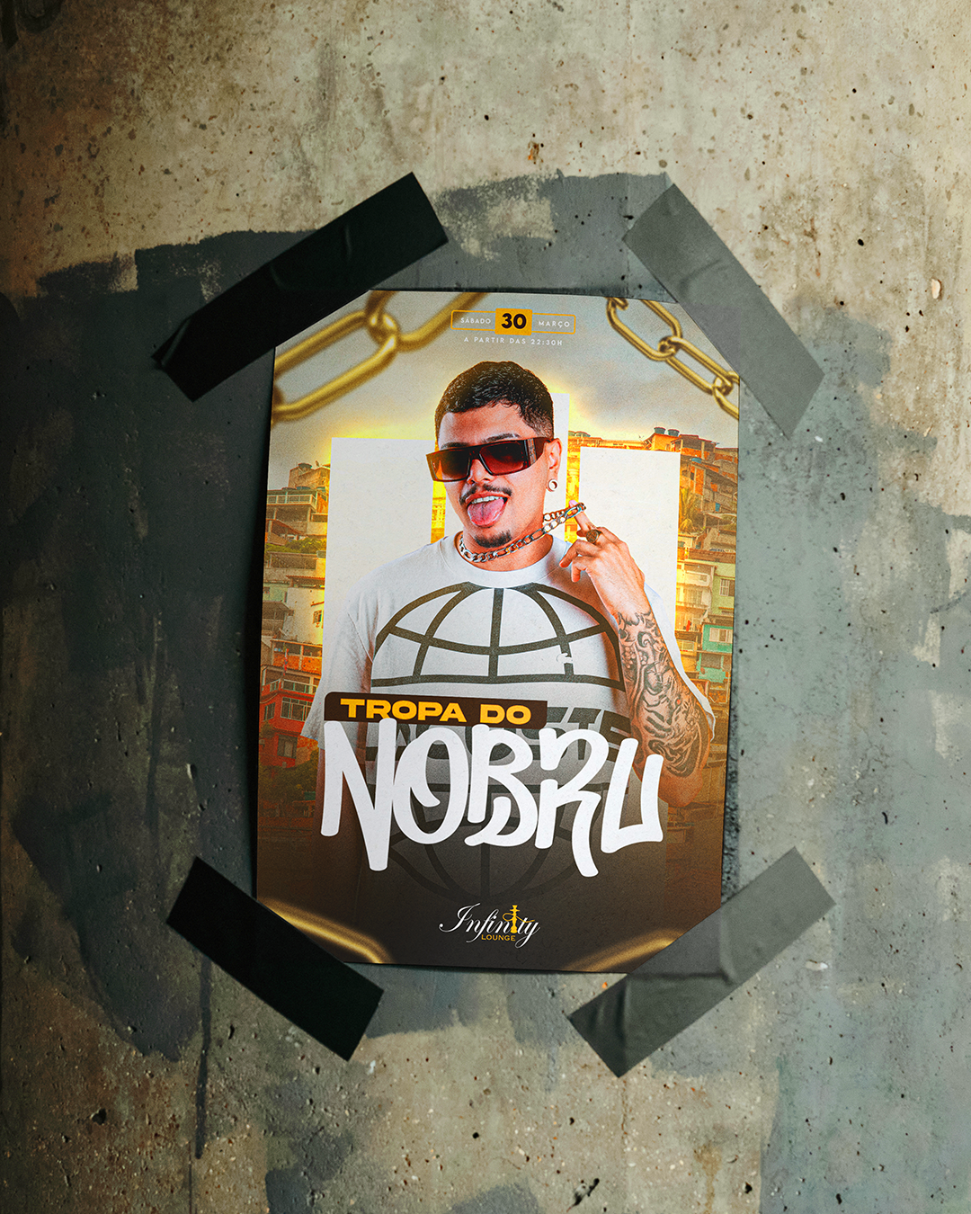 O cartaz oficial da Tropa do Nobru reflete a energia vibrante de uma festa que tomou conta da Infinity Lounge com muita música e animação. Sob o comando do DJ Nobru, artista em ascensão na cena do funk e ravefunk, o evento foi um sucesso absoluto! O design captura a vibe única da noite, conectando o público ao som envolvente e à experiência que só a Infinity Lounge proporciona.